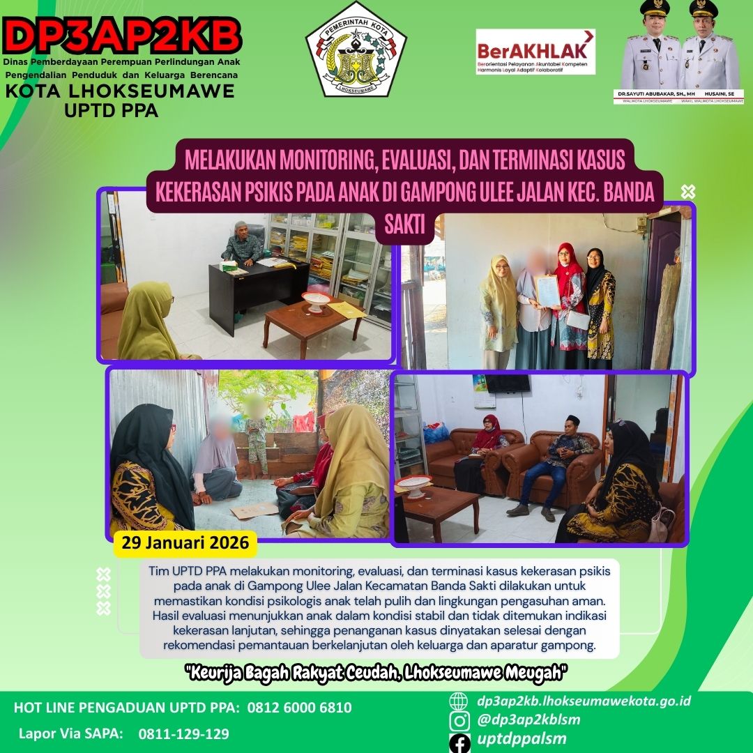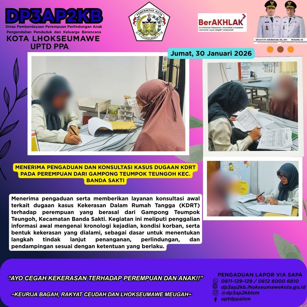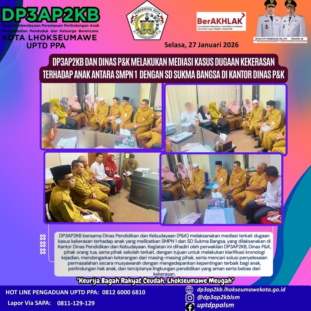 Lhokseumawe, 4 Januari 2026, Kolaborasi antar Dharma Wanita Persatuan (DWP) Pemko Lhokseumawe, Dinas Kesehatan, UPTD PPA dan Forum Anak Lhokseumawe Kreatif (FALAK) dalam kegiatan memberikan bantuan dan…