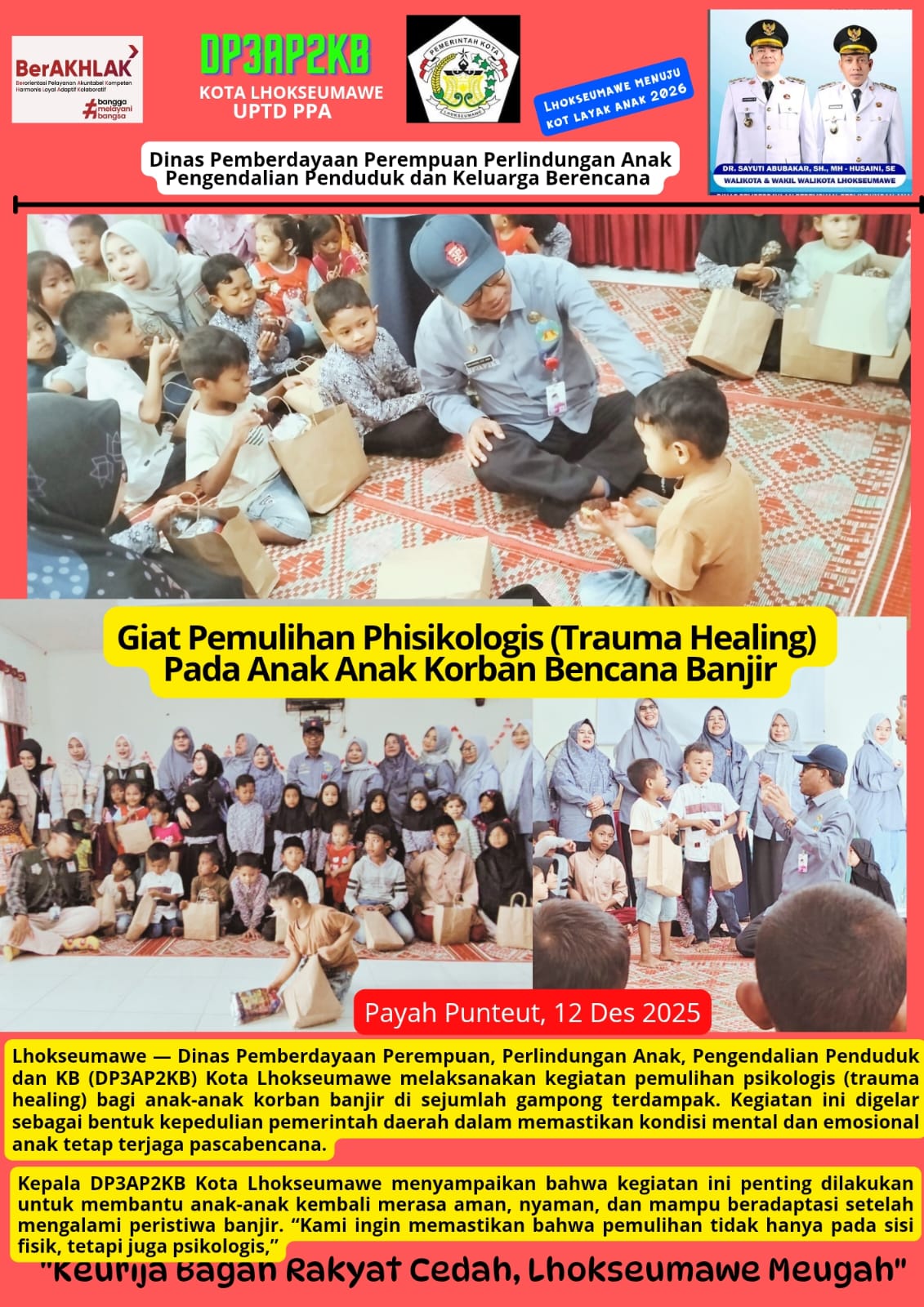 Lhokseumawe, 4 Januari 2026, Kolaborasi antar Dharma Wanita Persatuan (DWP) Pemko Lhokseumawe, Dinas Kesehatan, UPTD PPA dan Forum Anak Lhokseumawe Kreatif (FALAK) dalam kegiatan memberikan bantuan dan Trauma Healing Bagi Masyarakat Korban Banjir di Gampong Kubu, Blang Panjoe dan Pante Lhong Kabupaten…